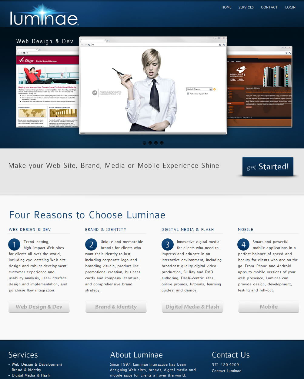 Main Page: Rotatibg banner for high impact imagery. Segmentation into four main focal points of the portfolio.